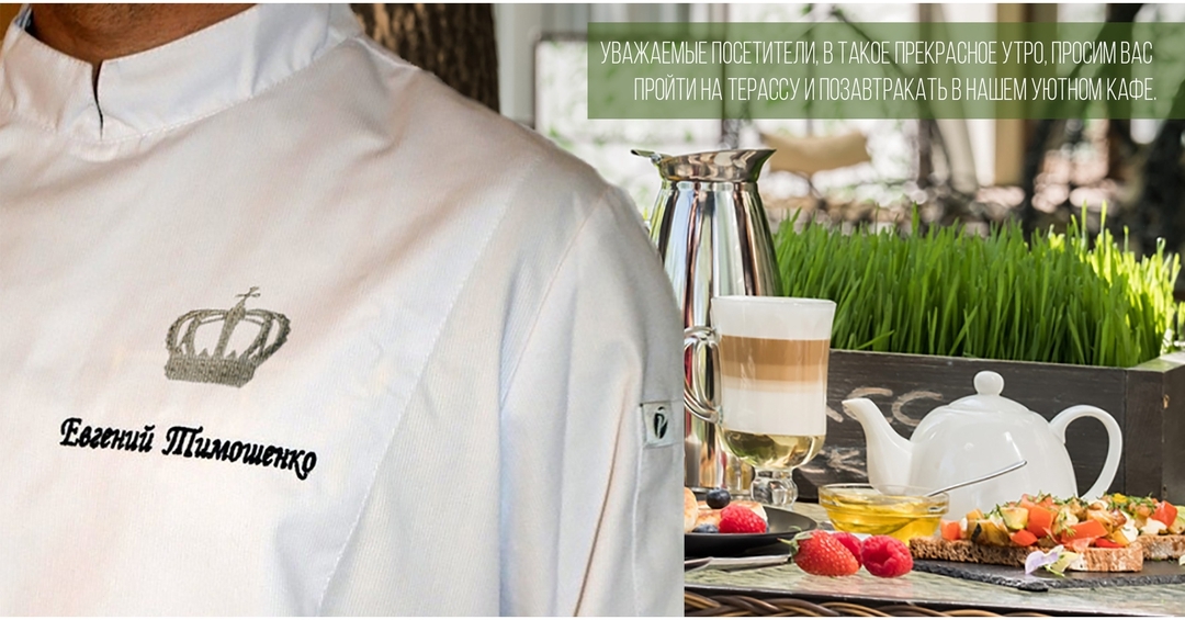 Прекрасное летнее утро. Хочется посидеть на свежем воздухе.Нас любезно приглашают пройти на террасу. Молодой человек в белоснежном брендированном кителе с золотой короной. Это так соответствует солнечному лучу, который падает на свежую зелень, белоснежную скатерть и отражается в зеркальном кофейнике с вкусно пахнущем кофе. ☕💋🍰