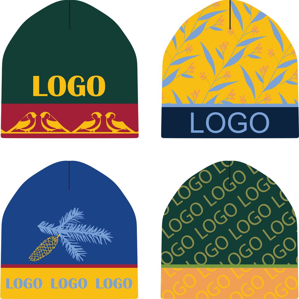 Шапка с вывязанным логотипом и индивидуальным рисунком в фирменной цветовой гамме.