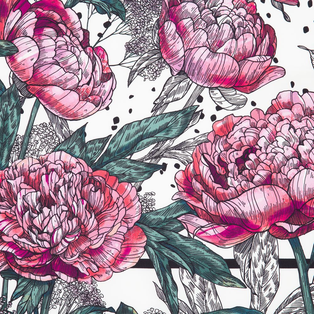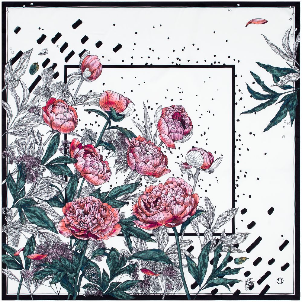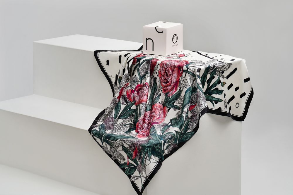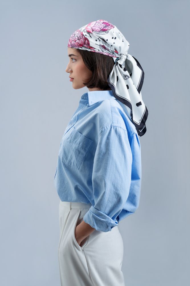 Шелковый платок с цветочным принтом открывает простор фантазии — его можно использовать как шарф, головной убор или декоративный элемент для верхней одежды и аксессуаров.