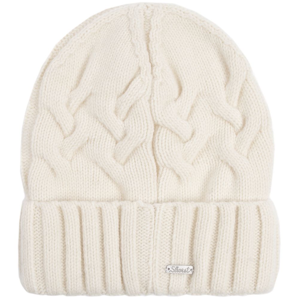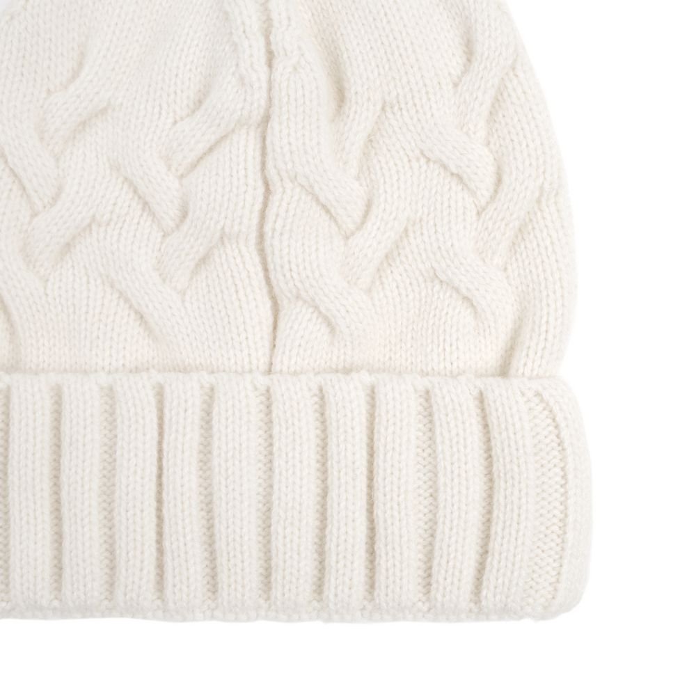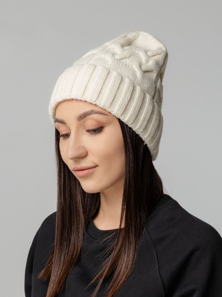 Однослойная шапка фактурной вязки с объемными косами и рельефным отворотом.