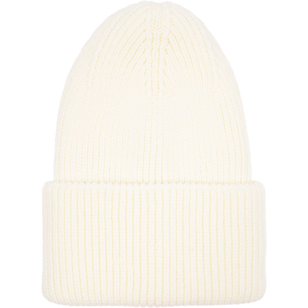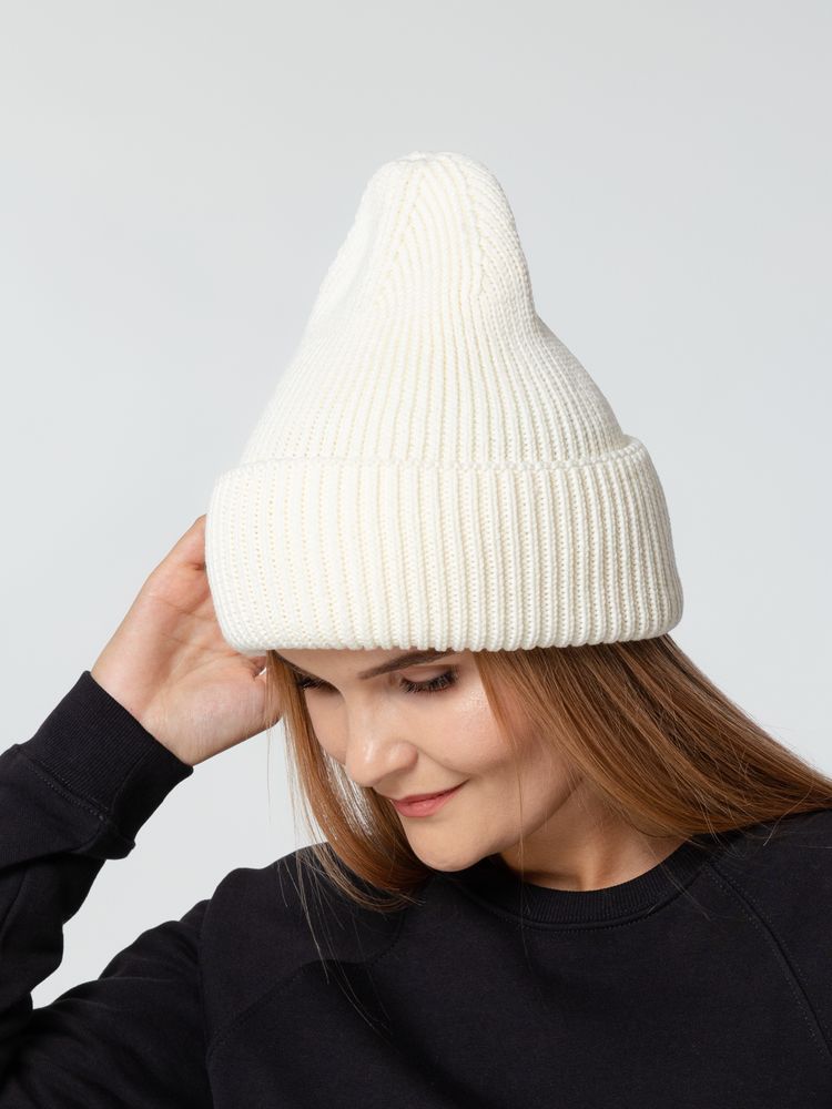 Удлиненная шапка объемной фактурной вязки с отворотом.