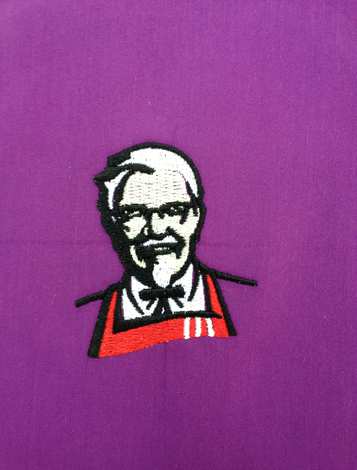 Этот год приносит нам новых заказчиков. Фирма ООО "Силуэт Проффи" начинают работу с нами. У них совсем немного вышивки. И вот появляется возможность заключить договор на пошив форменной одежды для фирмы KFC. Нам приходится потрудиться, чтобы удовлетворить руководство KFC в их желании иметь точную копию американской вышивки. Рассматривая нашу работу, руководство KFC отметило, что не верило в силы наших вышивальщиц. И, как говорит Задорнов, я испытала истинную гордость за своих соотечественников, хотя должна была гордиться собой. С тех пор мы вышиваем большое количество рубашек с портретом Полковника. Эта же фирма принесла нам заказ "Полушка- 24 часа", "Элитное серебро 985".