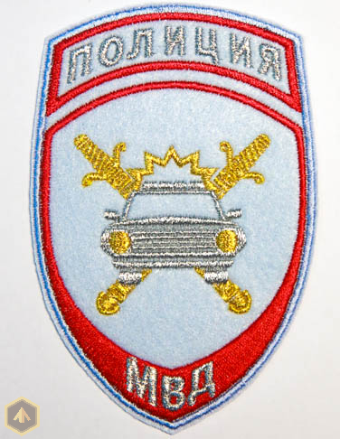Вышитый нарукавный знак отличия для сотрудников подразделения Госавтоинспекции (ГИБДД) МВД России на ткани стального цвета, размером 120 на 75 мм. Используются красные, золотые и серебрянные нити.
