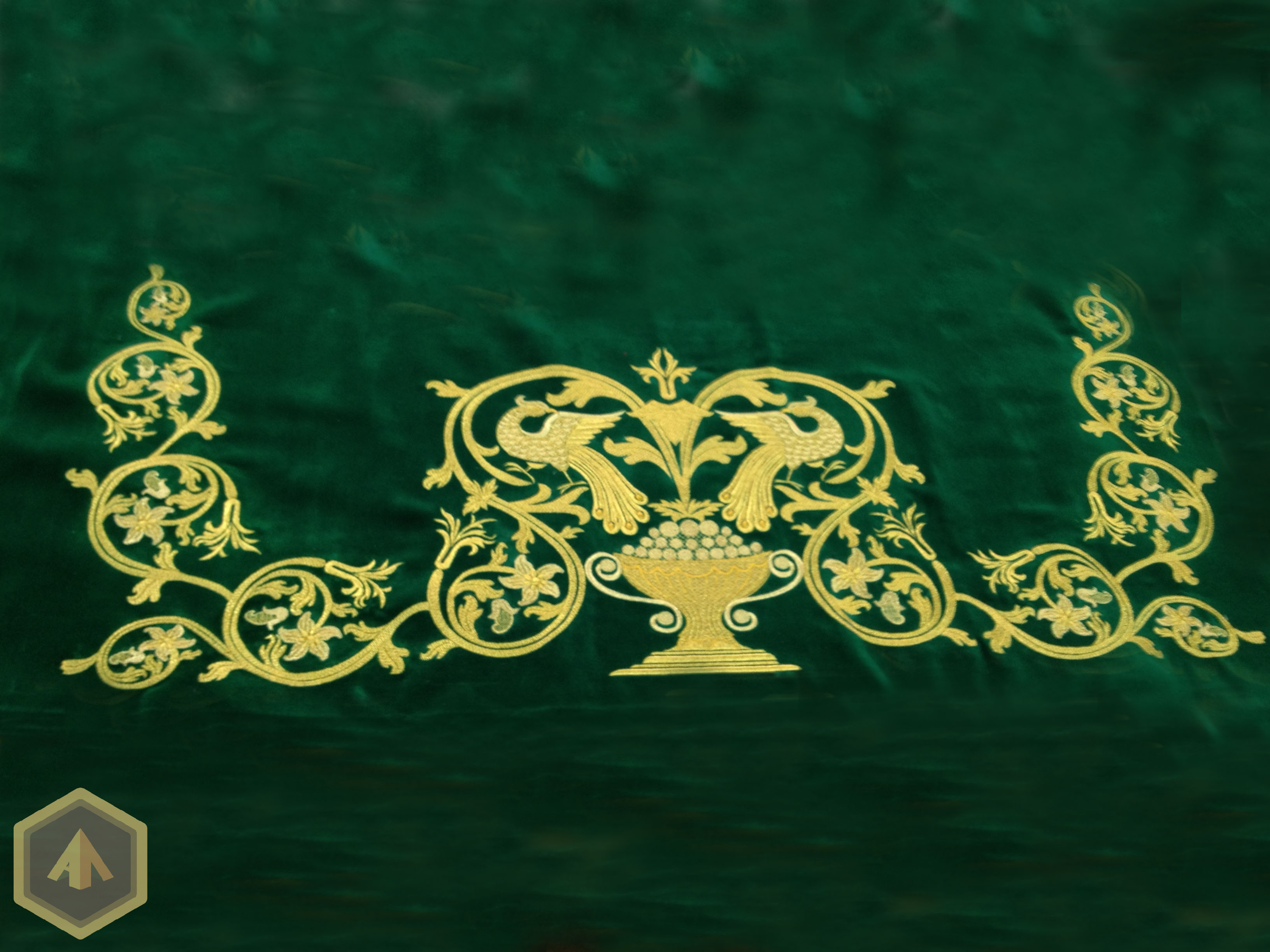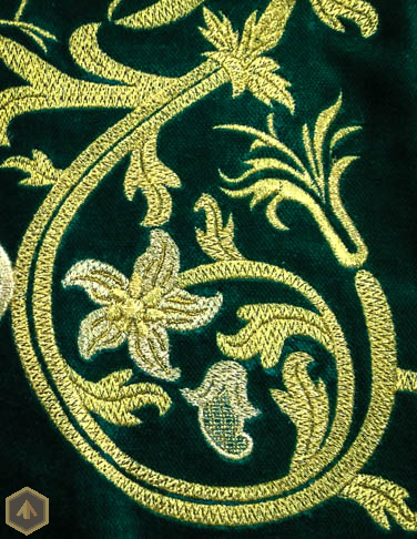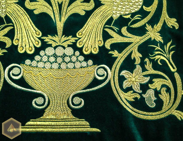 Оплечье на зеленом бархате. Вышивка металлизированной нитью, двумя оттенками золота. Рисунок составлен из растительного орнамента, виноградных лоз и птиц павлинов, олицетворяющих достаток.