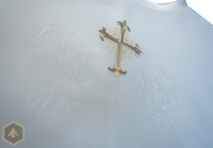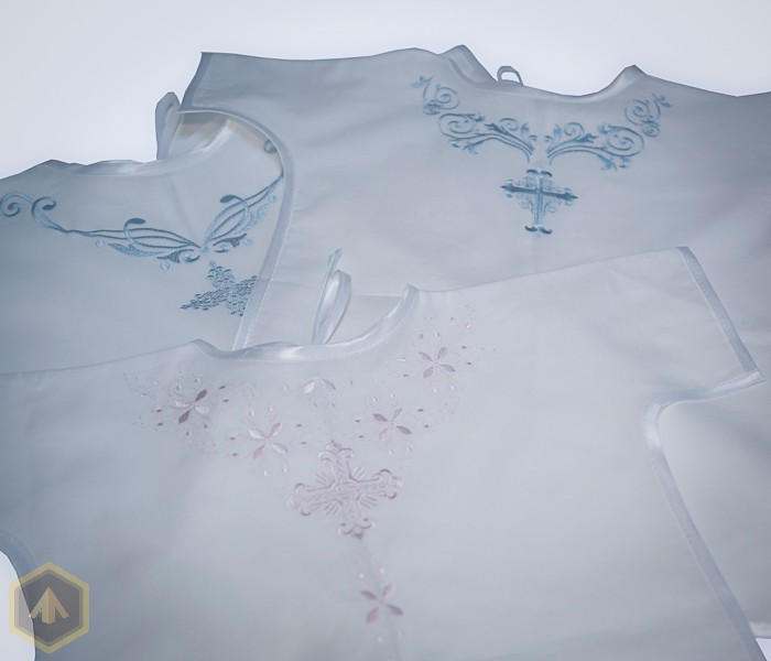 Главной одеждой для крестин являются крестная рубашка и уголок (крыжма). Для одежды принято выбирать ткань светлых тонов, как правило, белую, символизирующую невинность души. Цвет вышивки определялся полом ребенка. Крестильную рубашку мальчика украшают вышивкой голубыми нитками, а девочки – розовыми. Орнамент вышивки может быть различным, но обязательным атрибутом является вышитый крест. Его принято вышивать на рубашке и на капюшоне уголка, или крыжмы.