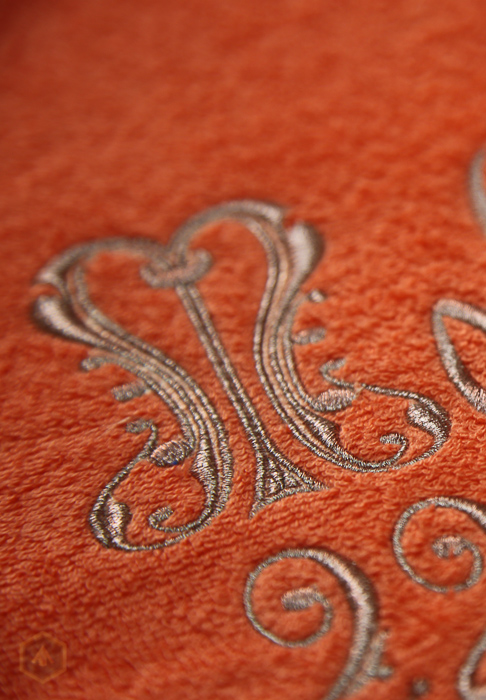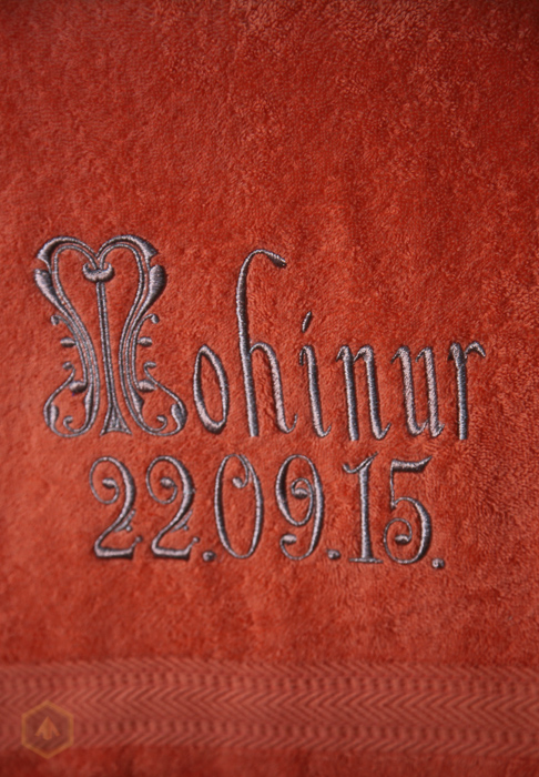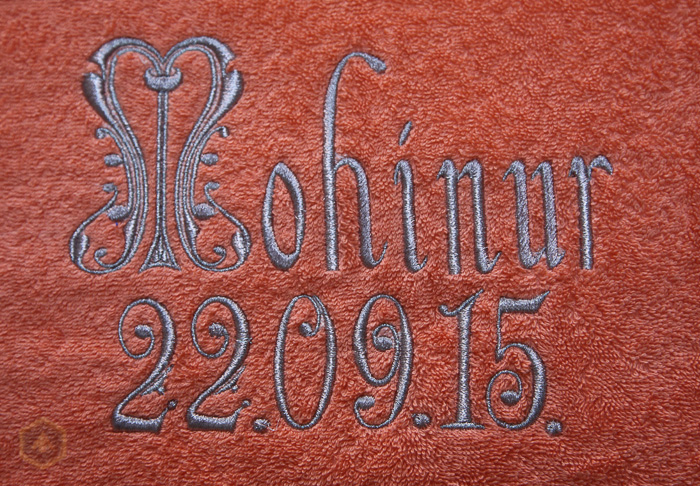 Именное, подарочное, махровое полотенце, вышитое серебряной металлической нитью. Вышивка на готовых полотенцах относиться к разряду вышивок на готовых изделиях. Поэтому эти работы ценятся дороже, чем обыкновенная вышивка на крое. Если фирма или офис заказывает от 10 штук полотенец с логотипом компании, это можно назвать оптом. Вышивка на махровых полотенцах имеет свои особенности. Во-первых, шрифт, выбранный для надписи, не должен быть слишком тонким, чтобы слова и даты были читаемы и не утопали в махре. Во-вторых, надпись на полотенце должна быть не очень большой, чтобы можно было это изделие использовать по назначению. И, в-третьих, вышивку надо делать, прокладывая специальный стабилизатор (водорастворимую пленку)